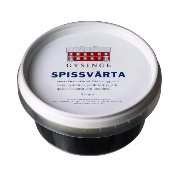 - Ta en klick spissvärta ur burken och späd under omrörning med balsamterpentin tills konsistensen blir som målarfärg. Måla därefter spisen flödigt med färgen. Färgen kryper nu ner i alla skrymslen och gropar även om den är »klumpig«.