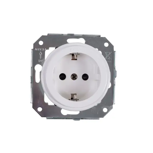 Classic recessed electrical outlet in white plastic without frame in a design that was common in Europe in the first half of the 20th century.