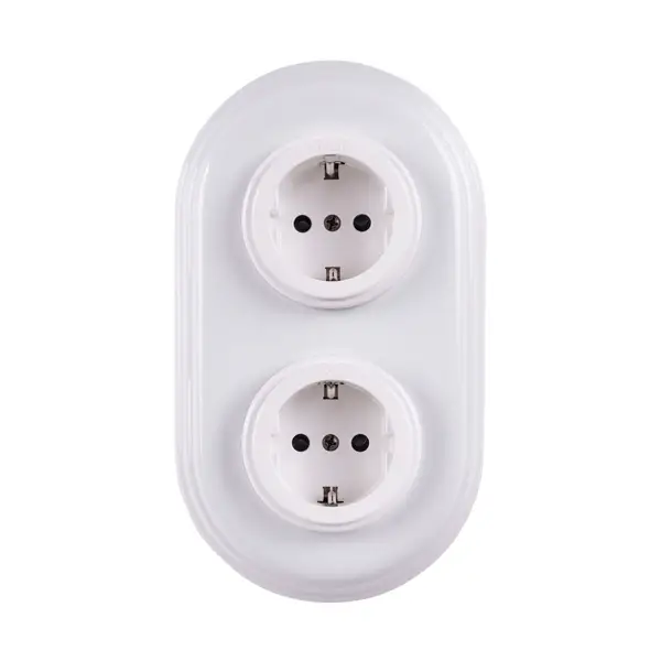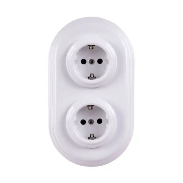 Double recessed socket with white plastic insert and white porcelain frame in a design that was common in Europe during the first half of the 20th century. Can be mounted vertically or horizontally.