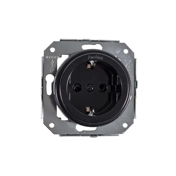 Classic recessed socket with black plastic insert and black porcelain frame in a design that was common in Europe during the first half of the 20th century.