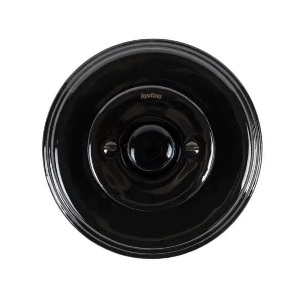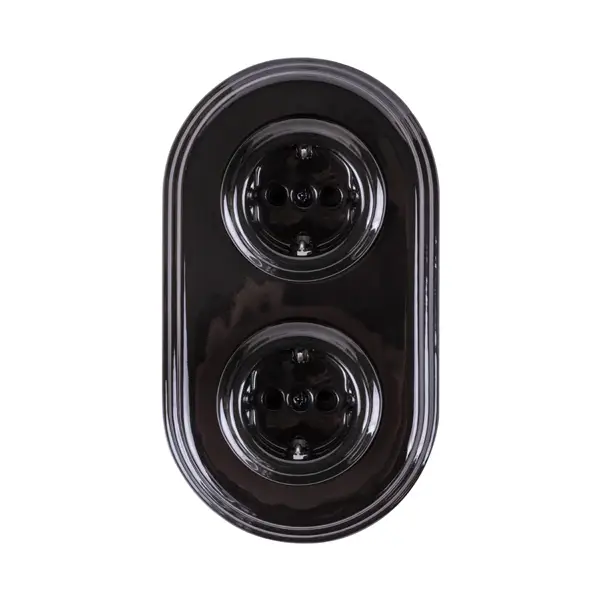 Classic surface-mounted electrical outlet in black porcelain in a design that was common in Europe during the first half of the 20th century.