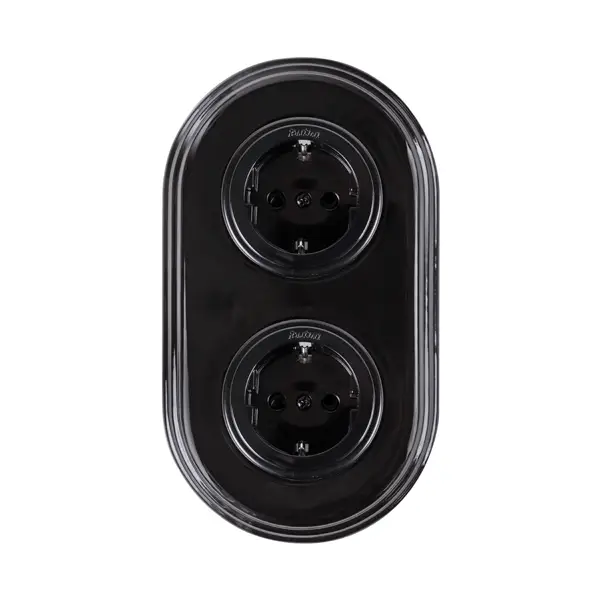 Double recessed socket with black plastic insert and black porcelain frame in a design that was common in Europe in the first half of the 20th century. Can be mounted vertically or horizontally.