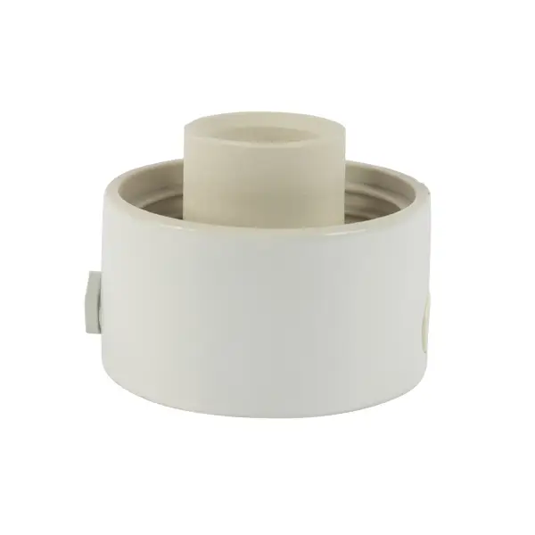 Straight single lamp holder of glazed porcelain. White color. Intended for outdoor wall and ceiling. Cable entry in the side of the base suitable for outdoor electricity.