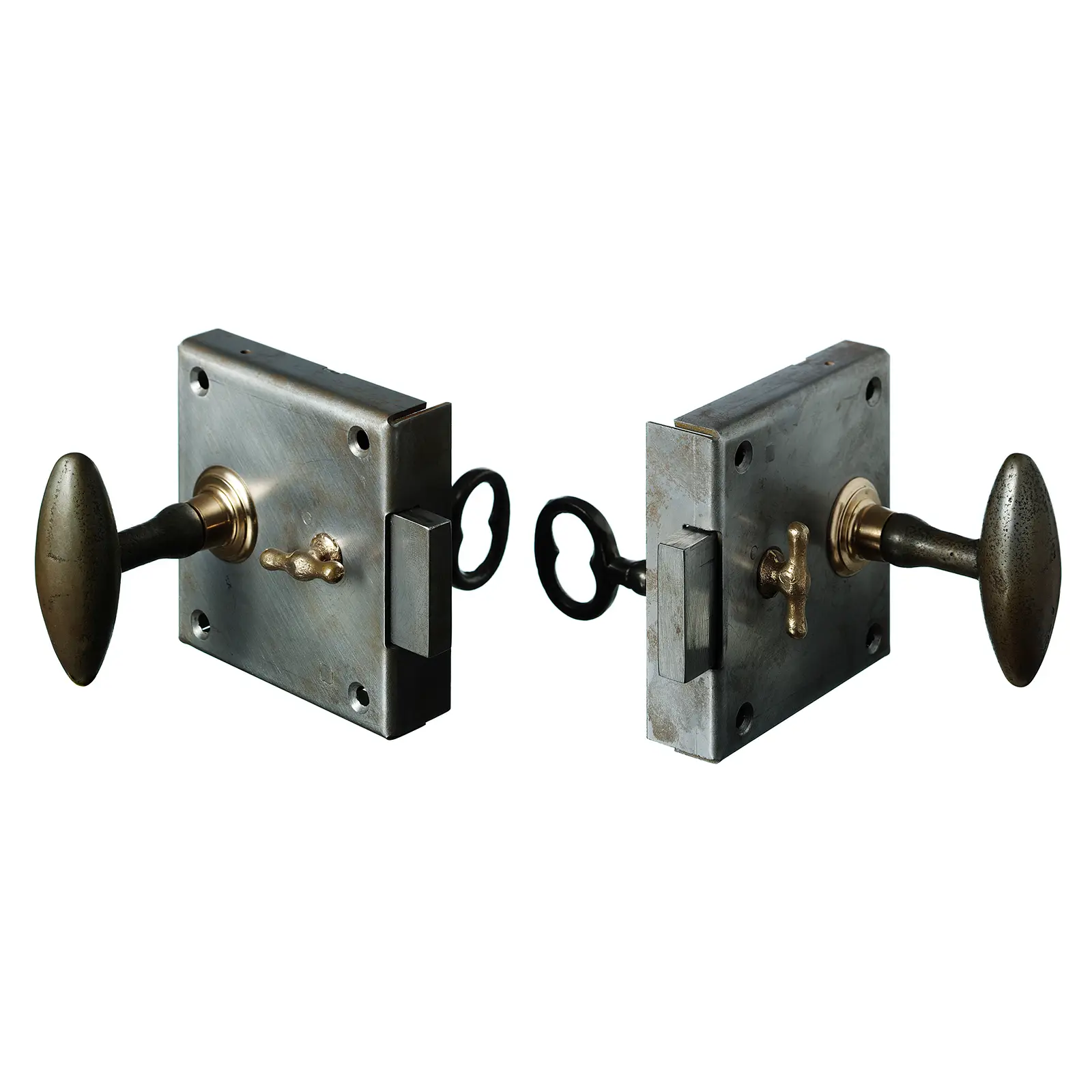 A fine chamber lock, typical of the mid-19th to early 20th century. Well made work with fine details in brass. Equipped with a locking knob to be locked from the inside. Available in both left and right models. Brass push button. Molded key included. Untreated iron, brass