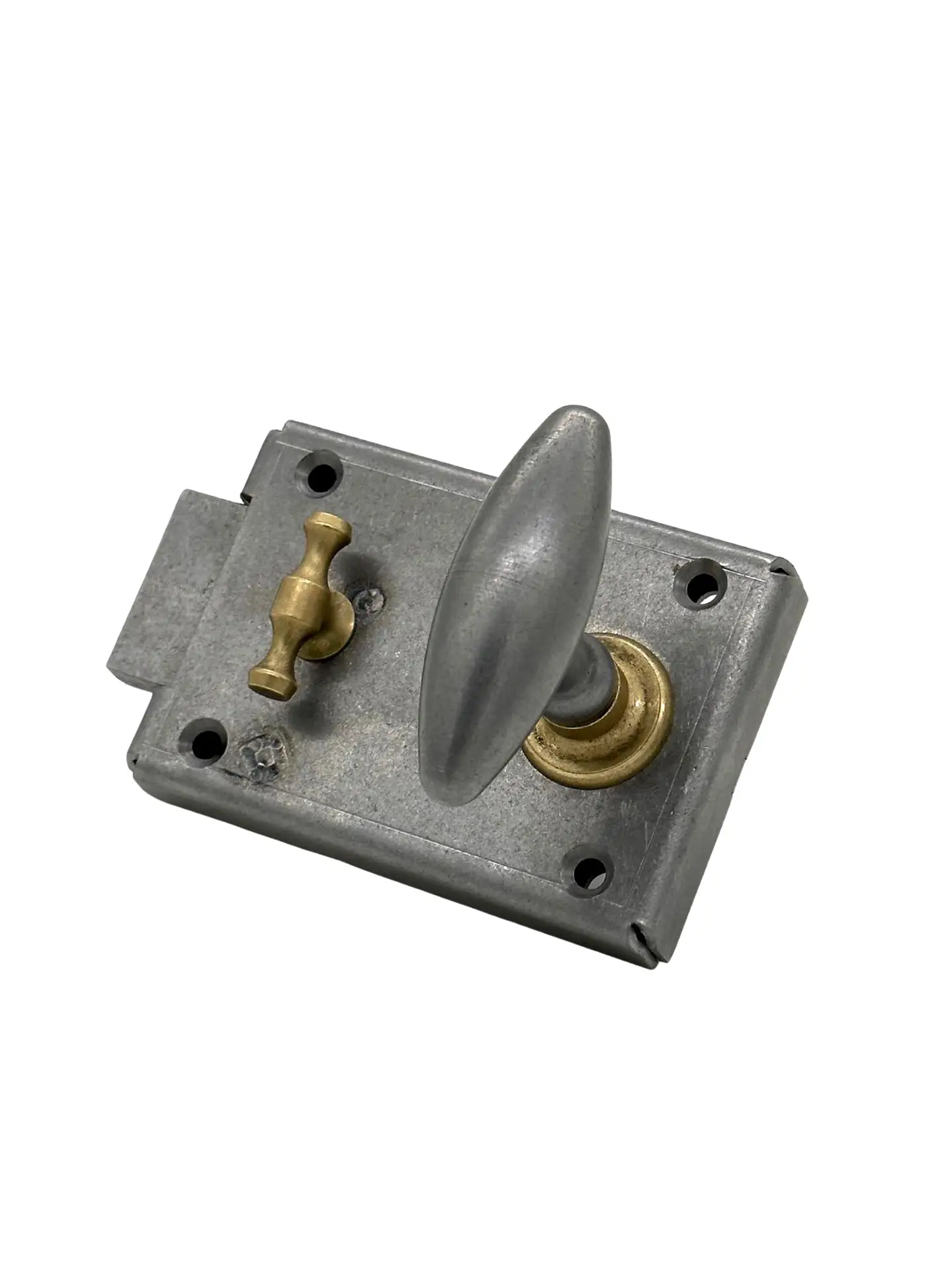 Solid chamber lock, typical of the late 19th century until the 1940s. Well made work with fine details in brass. Equipped with a locking knob to be locked from the inside. Available in both left and right models. Brass push button. Cast key included. Untreated iron, brass
