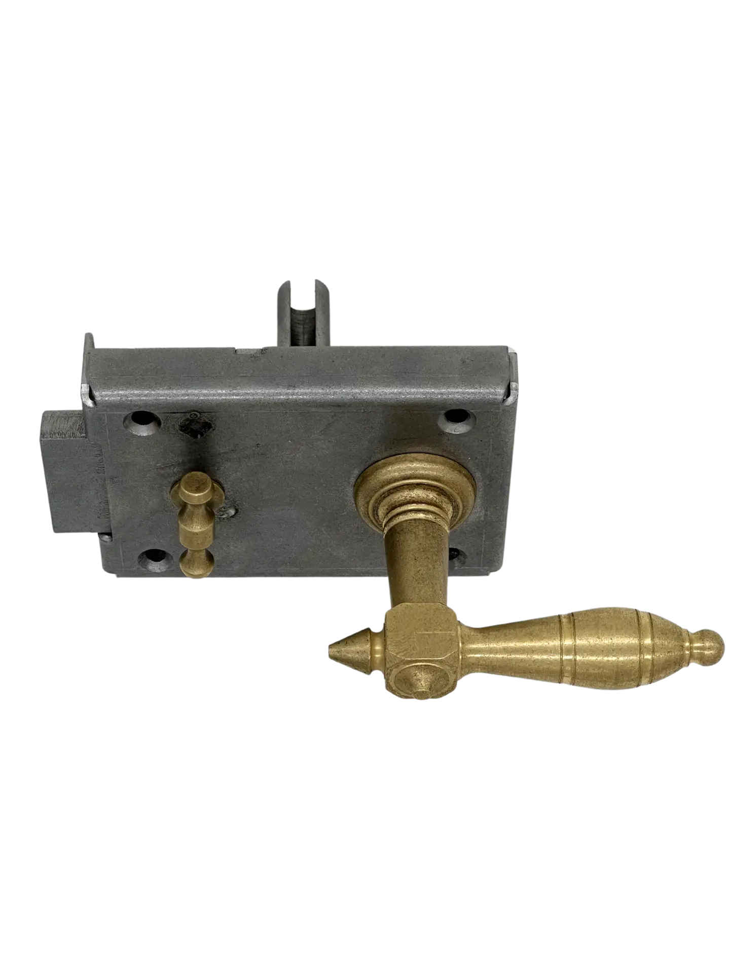 Solid chamber lock, typical of the late 19th century until the 1940s. Well made work with fine details in brass. Equipped with a locking knob to be locked from the inside. Available in both left and right models. Brass push button. Cast key included. Untreated iron, brass
