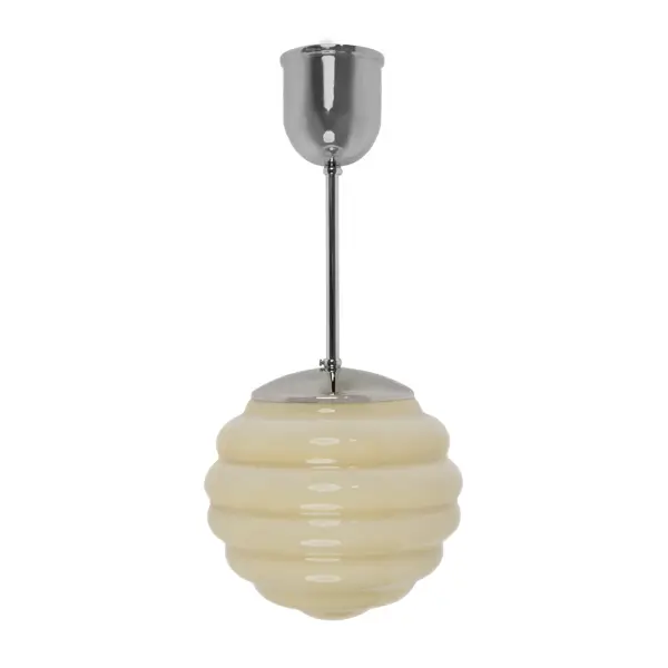 Classic ceiling lamp in Art Deco style. Existed in Sweden and Europe during the 1920-1930s. The glass cup has an undulating shape and is reminiscent of a beehive, hence its name. The glass cup is 20 cm in diameter, about 18 cm high and together with the pendulum the lamp is about 40 cm long.