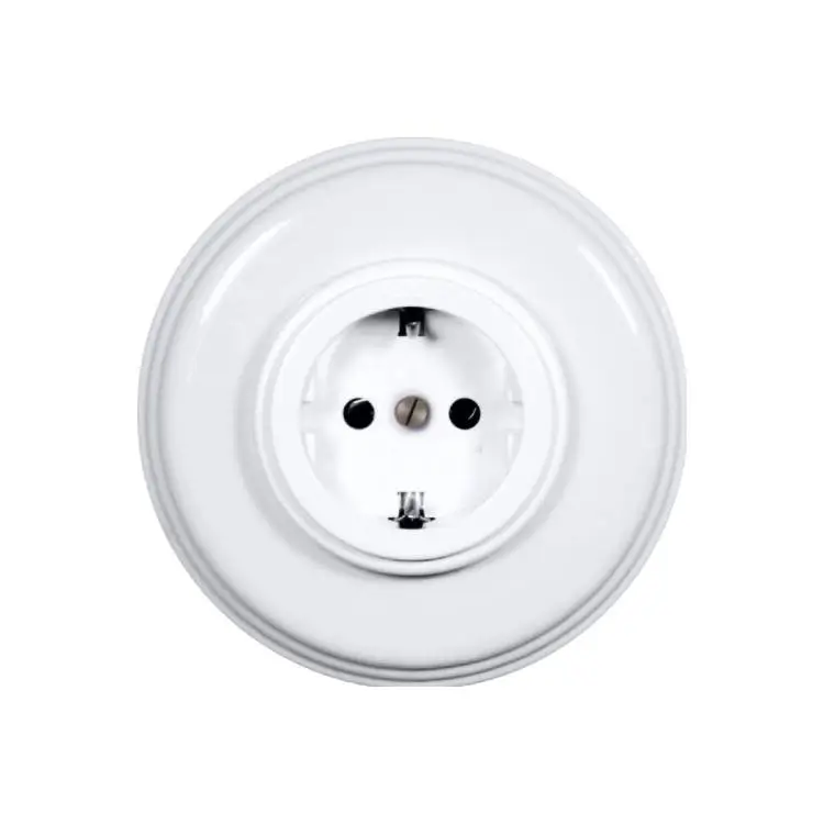 Classic recessed electrical outlet in white porcelain with a white porcelain frame in a design that was common in Europe during the first half of the 20th century.