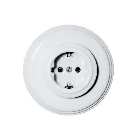 Classic recessed socket with white plastic insert and white porcelain frame in a design that was common in Europe during the first half of the 20th century.