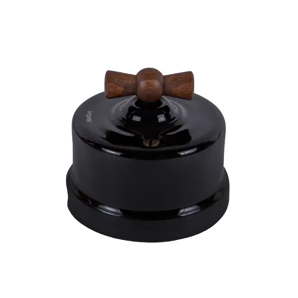 Dimmer switch with step switch function made of black bakelite for wall mounting. Press for on/off and turn to adjust brightness. This dimmer works with dimmable LED lamps and regular incandescent and low energy lamps. Also works with HV-Halogen and NV-Halogen with magnetic transformer. It does not work for NV-Halogen with electronic transformer.