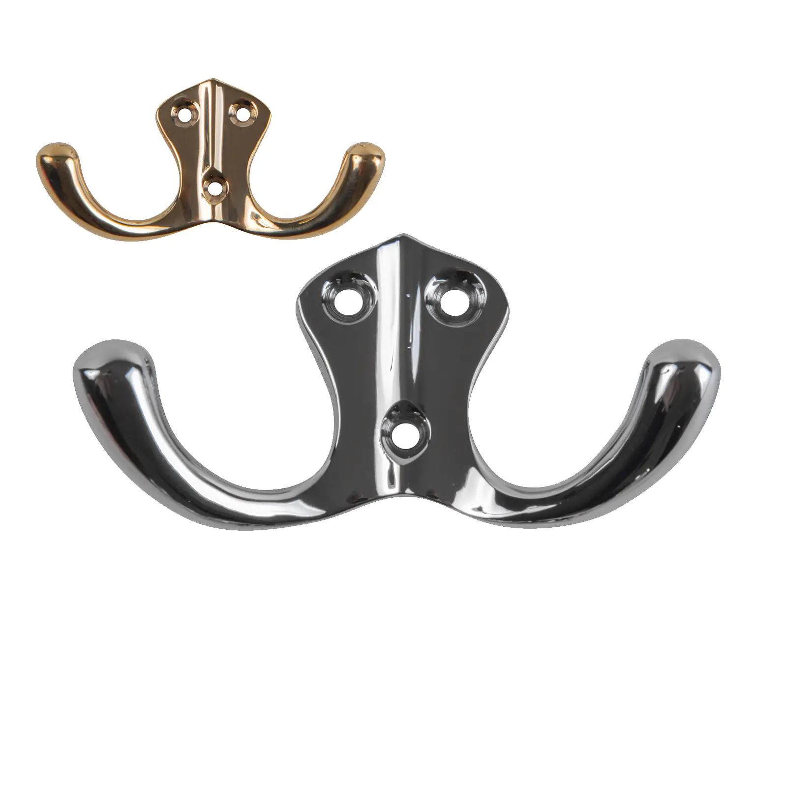 Classic double hook from the period 1920 to 1965. The hook is available in untreated brass or nickel-plated brass. Screws are included.