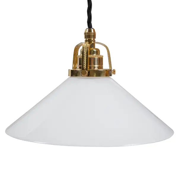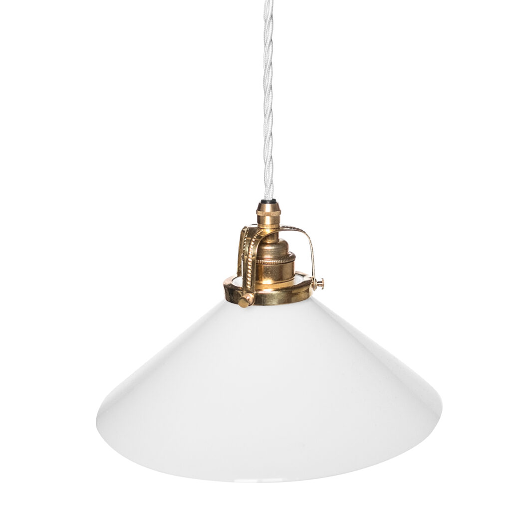 A specially designed brass cable strain relief relieves the cable from carrying the full weight of the luminaire. The deep, white glass shade provides a combination of general and concentrated light, without glare. Our lamp is a replica of an original luminaire. The shade holder, with its special rope bar decoration in relief, is handmade to match the high quality of the original lamp.
