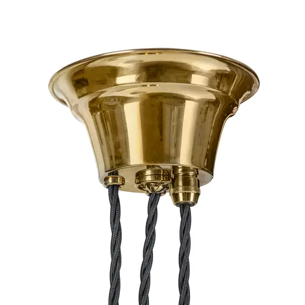 The lamp is supplied with one and a half meters of three-strand twisted black textile cord. All metal parts are made of solid, polished, unlacquered brass. Length 88-150cm, diameter shade 25cm.