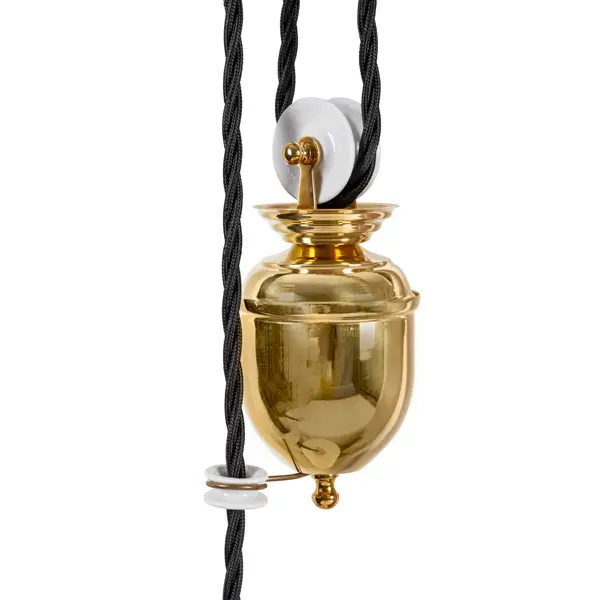 The elevator lamp is an evolved cobbler’s lamp, intended to hang above a table or workplace. The lamp was common both as a kitchen lamp and as an office luminaire, and was also used in other workplaces with a requirement for more concentrated light. The lifting device with its easy-rolling porcelain wheels makes the lamp adjustable in height.