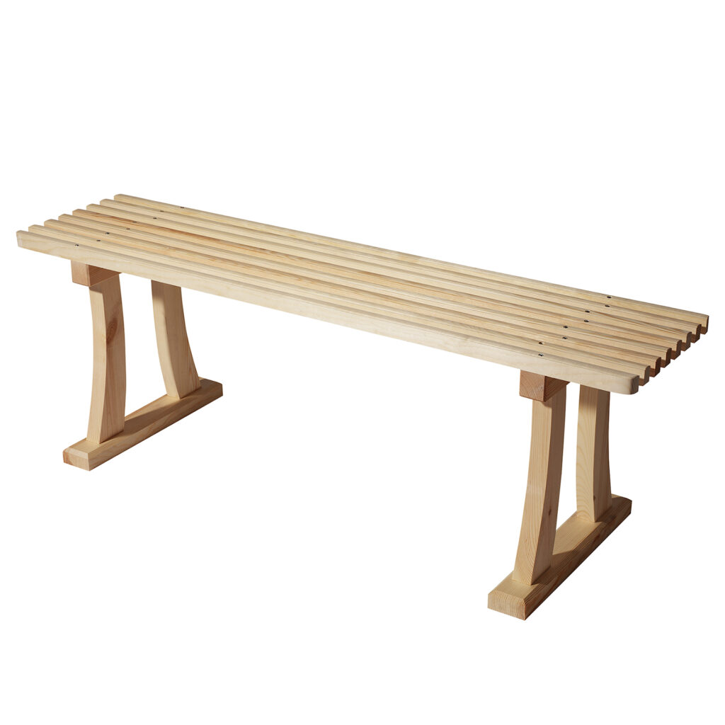 Seat made of three boards, joined together with strips. Base in the form of cross-shaped trestles with beam and wedges. The seat is attached to the trestle with locking pins and the entire bench can be easily dismantled.