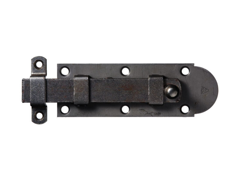 Hand-forged bolt, short model for external doors. Used for double doors where one door leaf is intended to be fixed and the other openable. Common model from the end of the 18th century to the middle of the 19th century. Long sliding bolt is mounted at the top of the door and short at the bottom. Can be used both as surface-mounted or recessed fittings. Supplied together with a closing plate for the door frame.