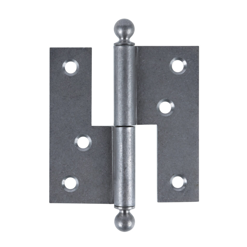 Solid chair hinge for exterior and interior doors. The model was common from around 1860 to the middle of the 20th century. Period-typical pointed knobs. Available in both left and right versions. High quality.