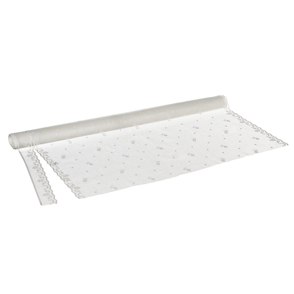 Lace or thread curtains were a very common import in Sweden from the late 19th century until the Second World War. Many patterns, like this one, were woven in Scotland, where there is a strong tradition of patterned cotton curtains. This curtain comes from the old Scottish collection and is still woven at one of the few remaining weaving mills. The curtain is made of the finest natural colored cotton and magnificently patterned with roses in vases, garlands, ribbons and borders. A typical hall curtain with a lavish pattern, suitable for the finest rooms in the house.