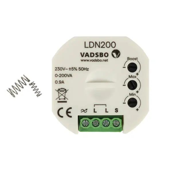Dimmer LED LDN200 from Vadsbo. Together with a spring-loaded push button, the dimmer creates a dimmer function.