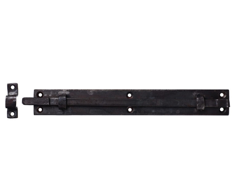 Hand forged bolt, long model for external doors. Used for double doors where one door leaf is intended to be fixed and the other openable. Common model from the end of the 18th century to the middle of the 19th century. Long sliding bolt is mounted at the top of the door and short at the bottom. Can be used both as surface-mounted or recessed fittings. Supplied together with a closing plate for the door frame.