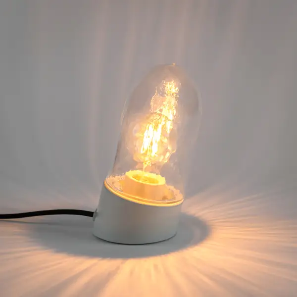 Angled plinth for wall mounting, angled 14°. Base of white glazed porcelain. Cup of clear glass, blown into shape. Intended for clear light source. The lamp is S-marked.