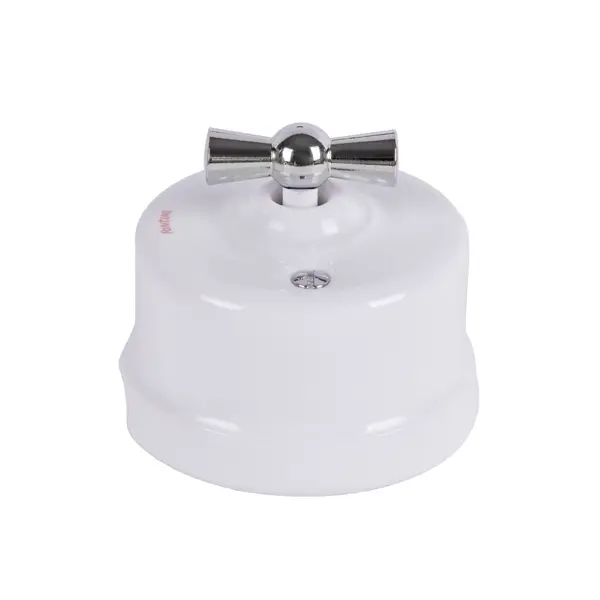 Classic surface mounted switch in white porcelain with chrome knob in a design that was common in Europe during the first half of the 20th century.