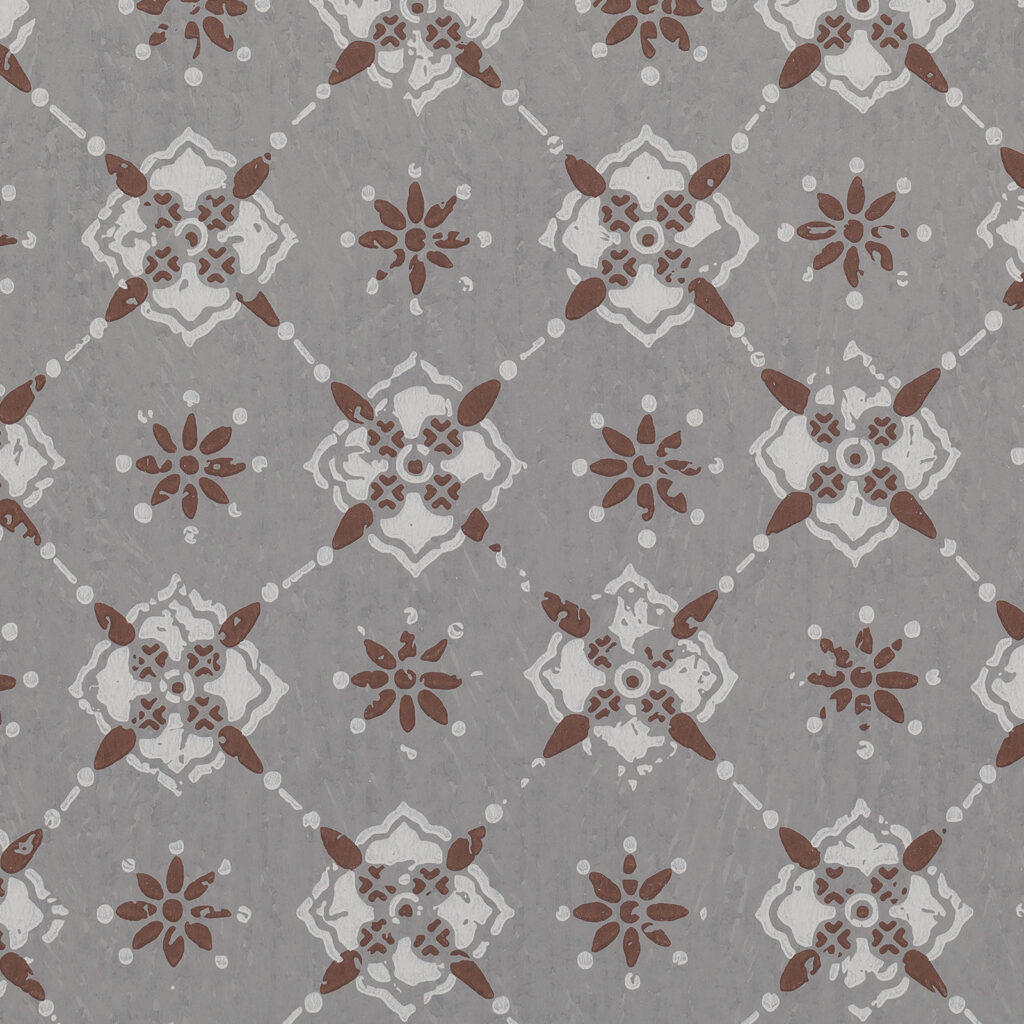 This particular wallpaper originally hung on the walls of a farm office at Wirum manor in Småland, and the date should be around 1880. It may be justified to point out that the wallpaper was on the walls, because small-patterned wallpapers often ended up on the ceiling in the gloomy, over-decorated interiors of the late 19th century. As wallpaper on the walls of simple cottages, or rooms such as farmhouses, kitchens and chambers, “The Farm Office” is an unbeatable mood creator along with white boarded ceilings, shed floors and rather dark carpentry.