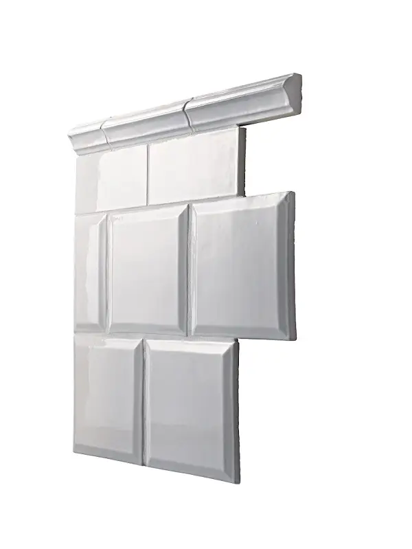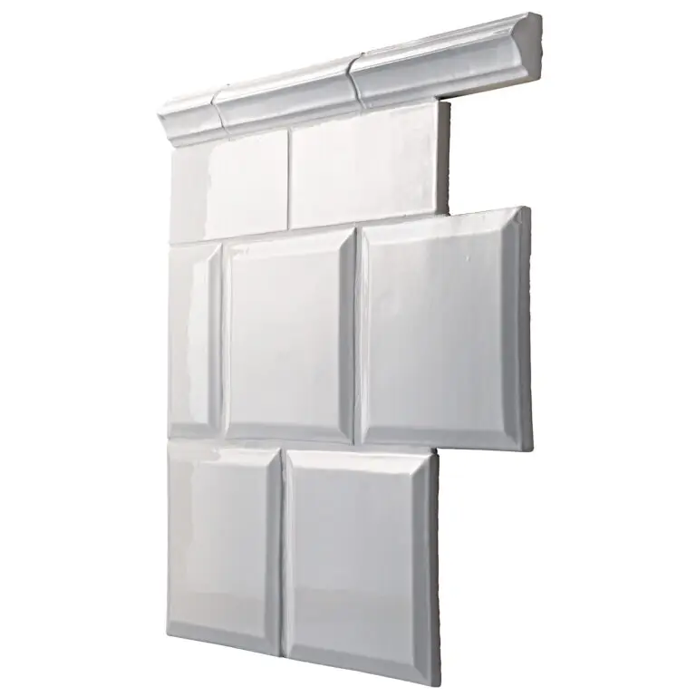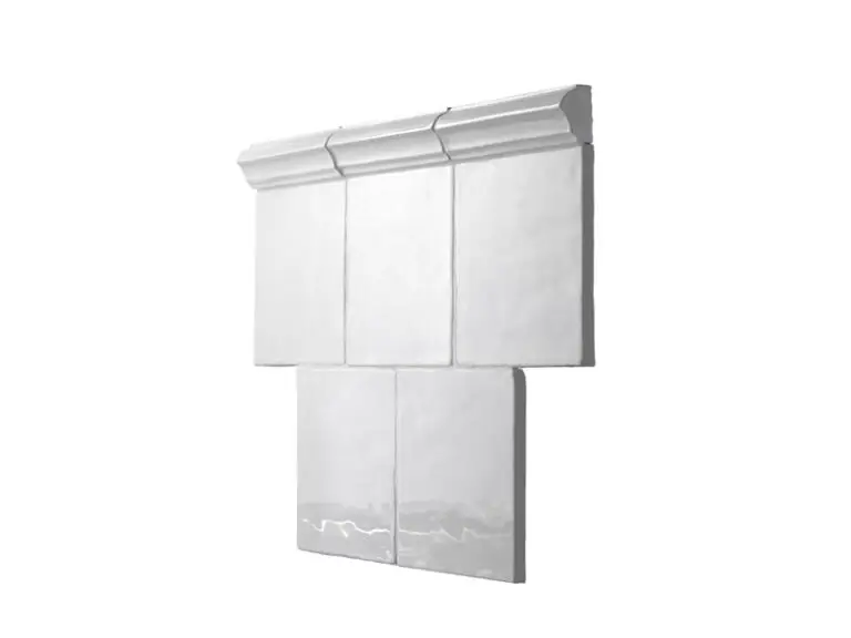 Svensktillverkad handgjord bröstlist. Vitglaserad för hand. Längd 150mm, höjd 40mm, tjocklek 28mm. Åtgång 6.5st/m. Bröstlisten kan geras i hörnen.