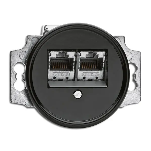 Nätverksuttag i bakelit för två RJ45. Passar med täckkåpa i bakelit från THPG