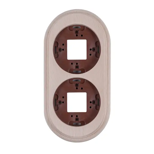 Bottenplatta med två fack i obehandlad bok. Avsedd för montering av Fontinis utanpåliggande strömbrytare och uttag i infälld dosa.