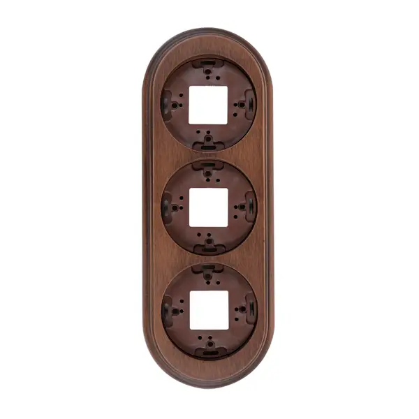Bottenplatta med tre fack i mörkbetsad bok. Avsedd för montering av Fontinis utanpåliggande strömbrytare och uttag i infälld dosa.