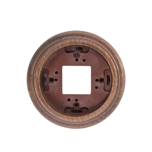 Rund bottenplatta i mörkbetsad bok. Främst avsedd för montering av Fontinis utanpåliggande strömbrytare och uttag i infälld väggdosa.
