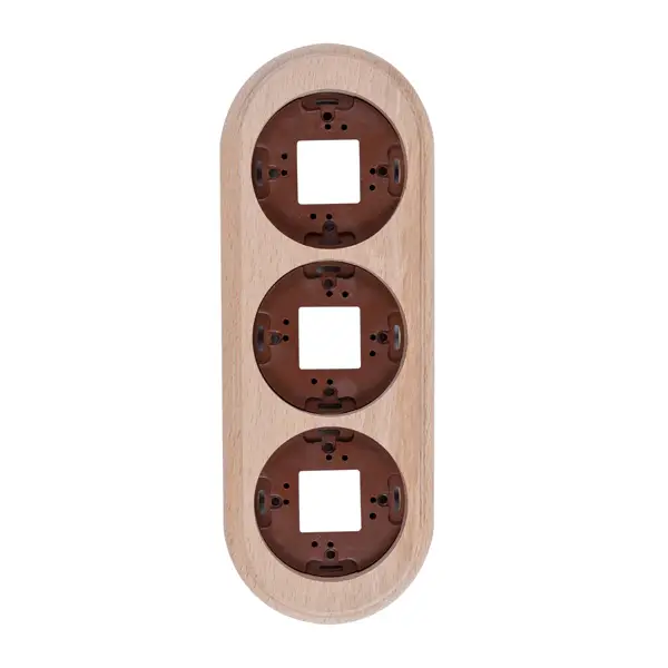 Bottenplatta med tre fack i obehandlad bok. Avsedd för montering av Fontinis utanpåliggande strömbrytare och uttag i infälld dosa.