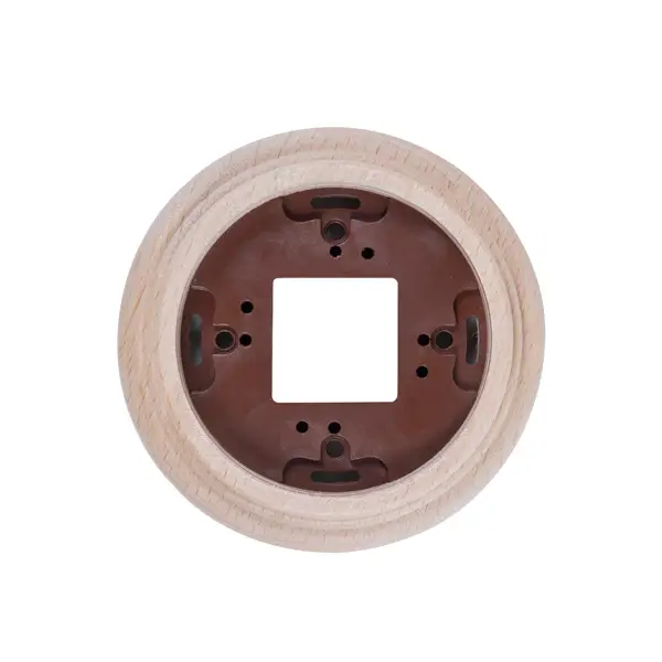Rund bottenplatta i obehandlad bok. Främst avsedd för montering av Fontinis utanpåliggande strömbrytare och uttag i infälld väggdosa.