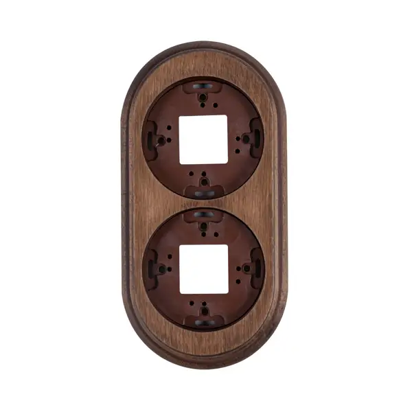 Bottenplatta med två fack i mörkbetsad bok. Avsedd för montering av Fontinis utanpåliggande strömbrytare och uttag i infälld dosa.