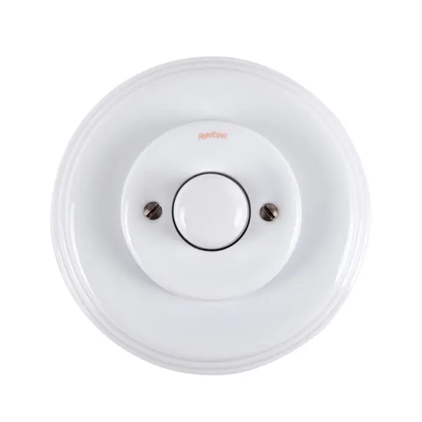 Infälld återfjädrande dubbeldimmer i vit porslin utan ram och vred i ett utförande som var vanligt förekommande i Europa under 1900-talets första hälft.