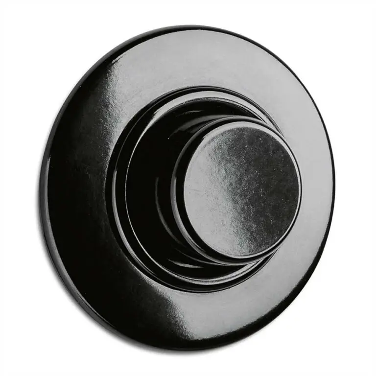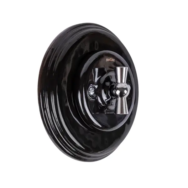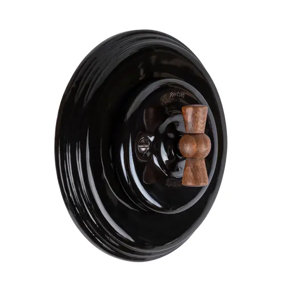 Infälld återfjädrande dubbeldimmer i svart porslin utan ram och vred i ett utförande som var vanligt förekommande i Europa under 1900-talets första hälft.