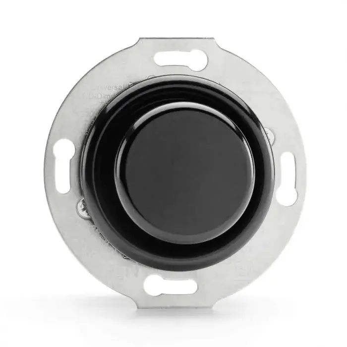 Dimmer med trappfunktion i svart porslin avsedd för infällnad i vägg. Knappen trycks in för att slå på/av en ljuskälla samt vrids för att reglera ljusstyrkan.