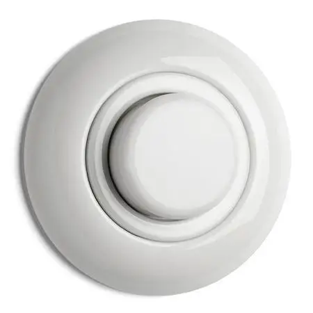 Dimmer med trappfunktion i vit porslin avsedd för infällnad i vägg. Knappen trycks in för att slå på/av en ljuskälla samt vrids för att reglera ljusstyrkan.