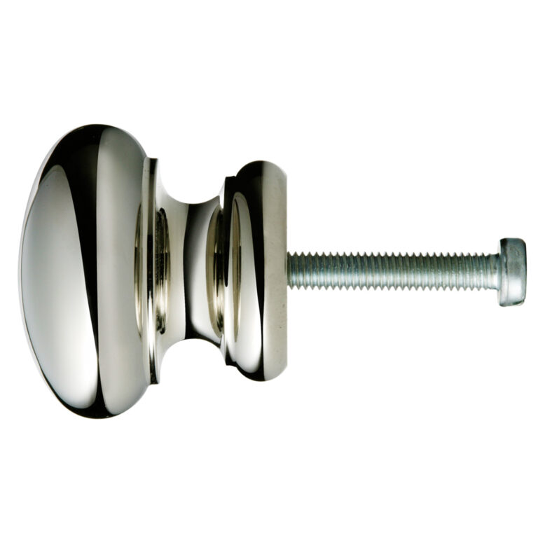 Massiv, mycket välgjord förnicklad knopp till framför allt köksluckor och lådor. Tillverkad efter en modell från tidigt 1900-tal som ofta kombinerades med förnicklade skålhandtag. Samma modell av knopp förekommer även som ändknopp på våra förnicklade köksspisstänger. Samma knopp finns även i polerad mässing.