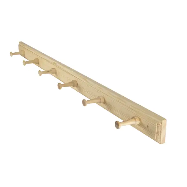 Enkel klädhängare i furu efter förlaga från tidigt 1900-tal. Typen är vanlig från 1700-talet och framåt. Rejäl och användbar till både kläder och annat. Brukade oftast vara omålad. Tre längder, en med tre knoppar, en med sex och en med tio. Knopparna är täljda.