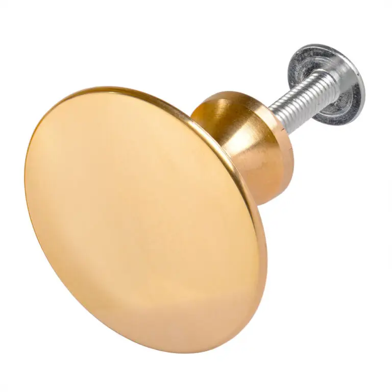 Massiv välgjord mässingsknopp för luckor och lådor efter en förlaga som var vanlig under hela 1800-talet, fram till 1900-talets början. Modell från Gysinge. Ø 30 mm. Motskruv av järn.