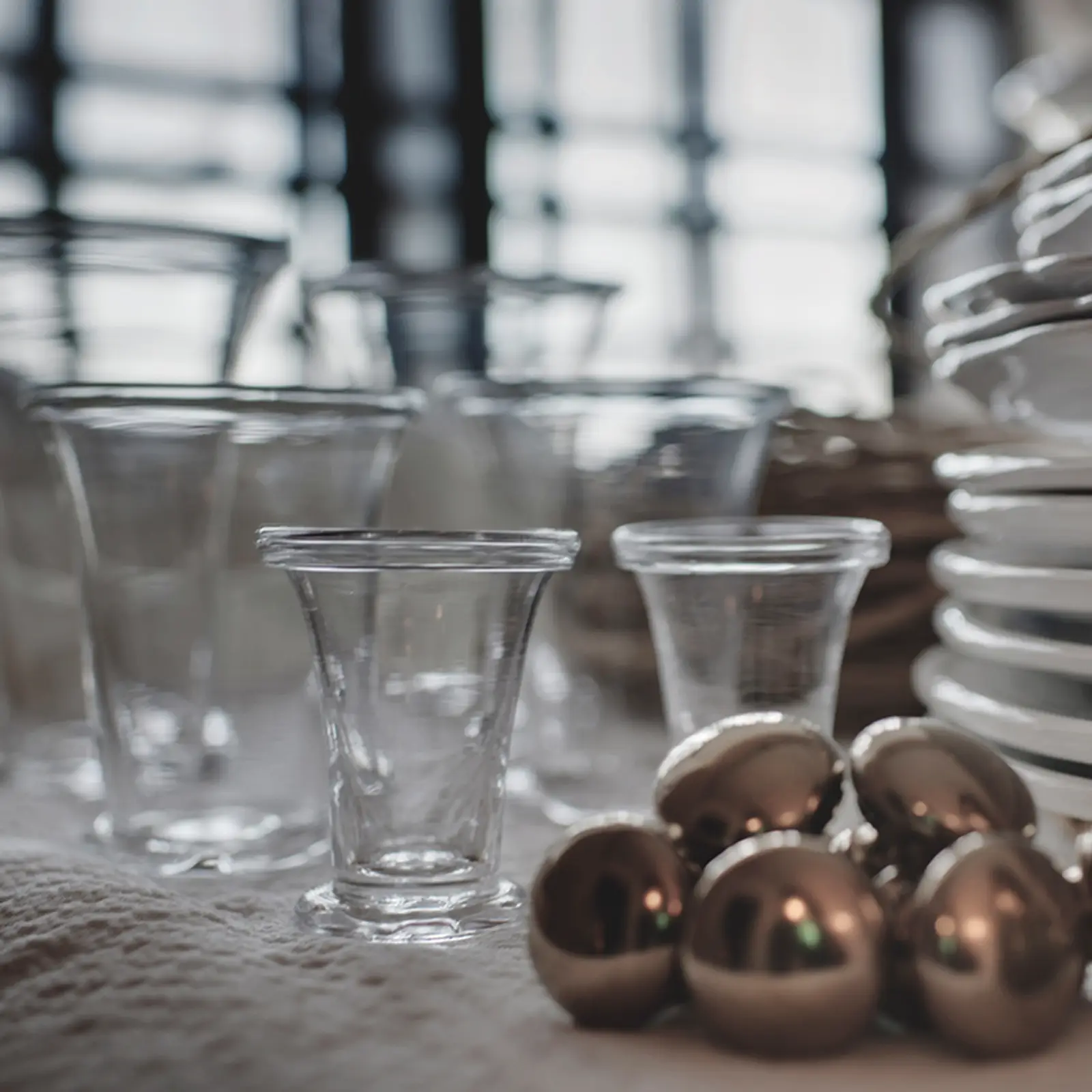 Våra bägarglas är handblåsta och därför lika individuella som originalen. Glasmassan varierar med ojämn tjocklek, sliringar, ränder och ibland blåsor. Puntelmärket under klacken visar var glasblåsarens pipa suttit. Den omvikta mynningskanten är också en typisk 1700-talsdetalj.