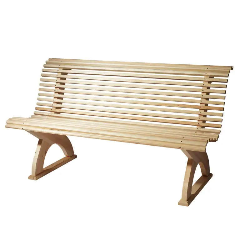 Enkel trädgårdsbänk med ribbsits och svagt svängda ben efter modell från sekelskiftet. Benen vilar på sulor av ”offervirke”, som skyddar för rötskador och lätt kan bytas ut.