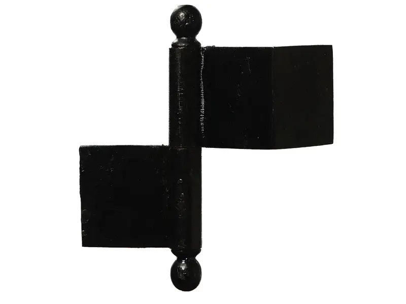 Handsmidda stolpgångjärn till ytter- och inomhusdörrar. Typen blev vanlig i slutet av 1700-talet. Kännetecknande är den kulformiga, sänksmidda knoppen som avslutar gångjärnstappen upptill och nertill. Modellen med omvikt gångjärn runt dörrbladet, s k fransk typ. Finns både i vänster- och högerutförande. Handsmide av högsta kvalitet.