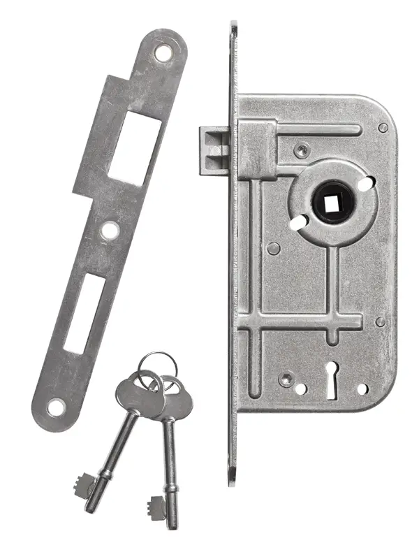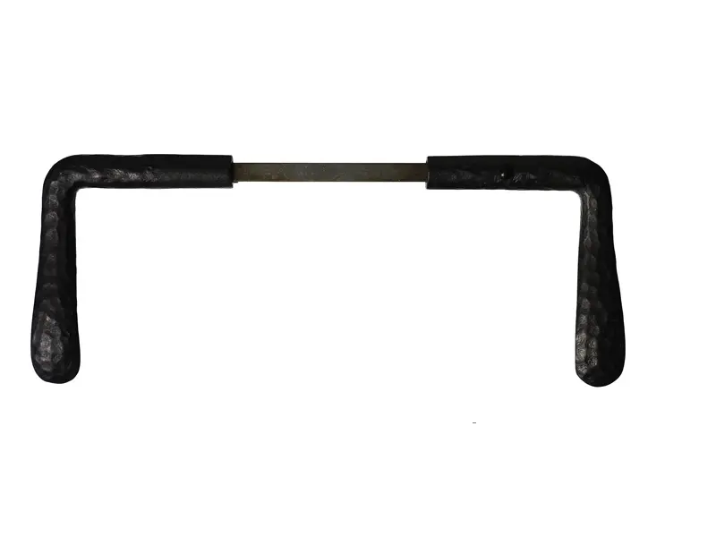 Järn. Centrumavstånd mellan tryckets hål och nyckelhål är 7,3 cm. Stången längd passar till dörrar med upp till 8 cm tjocklek, den kapas till önskad längd. Längd trycke 10cm, nyckelslylt 4,2x19cm, stång 0,8×0,8cm. Skruv ingår!