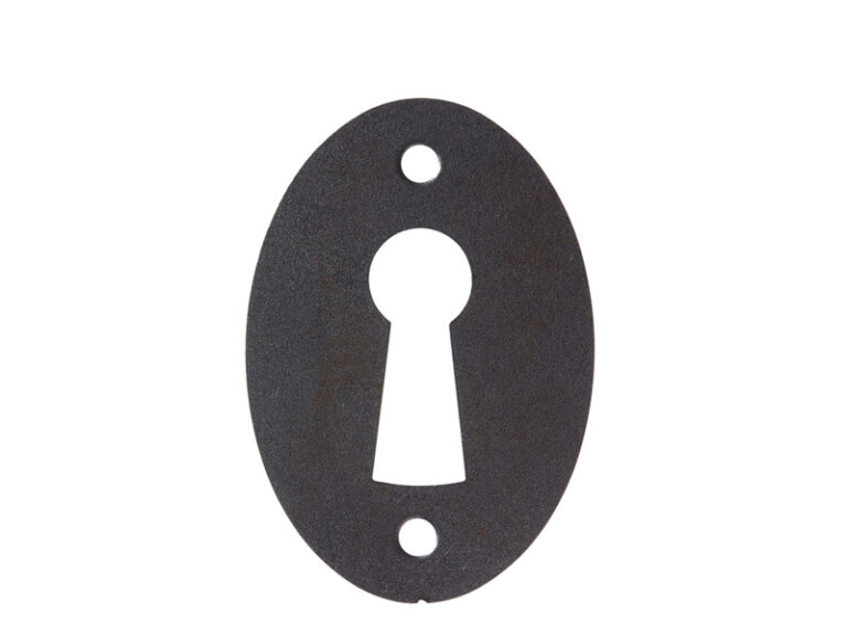 Oval nyckelskylt av obehandlad järnplåt av en modell som varit vanlig ända sedan 1700-talet.