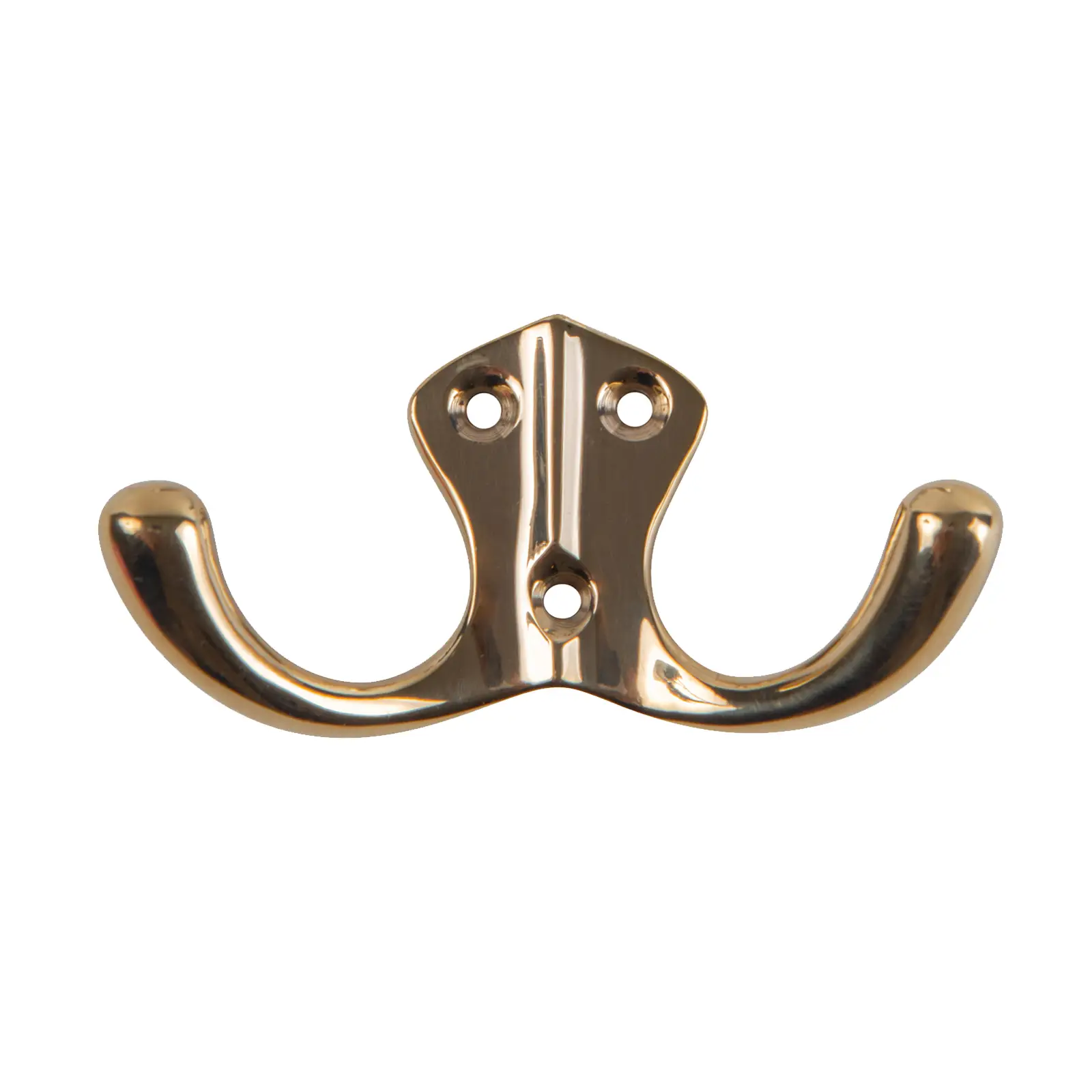 Klassisk dubbelkrok från tidsperioden 1920 till 1965. Kroken finns i obehandlad mässing eller förnicklad mässing. Skruvar medföljer.