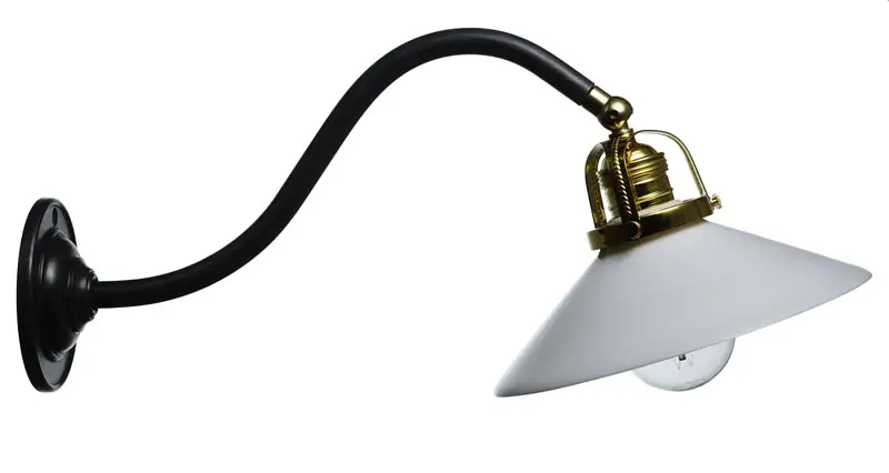 Sned sockel för montering på vägg, vinklad 14°. Sockel av svartglaserat porslin. Kupa av klarglas, blåst i form. Avsedd för klar ljuskälla. Lampan är S-märkt.