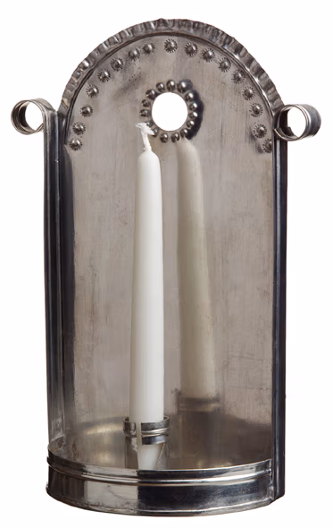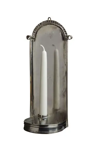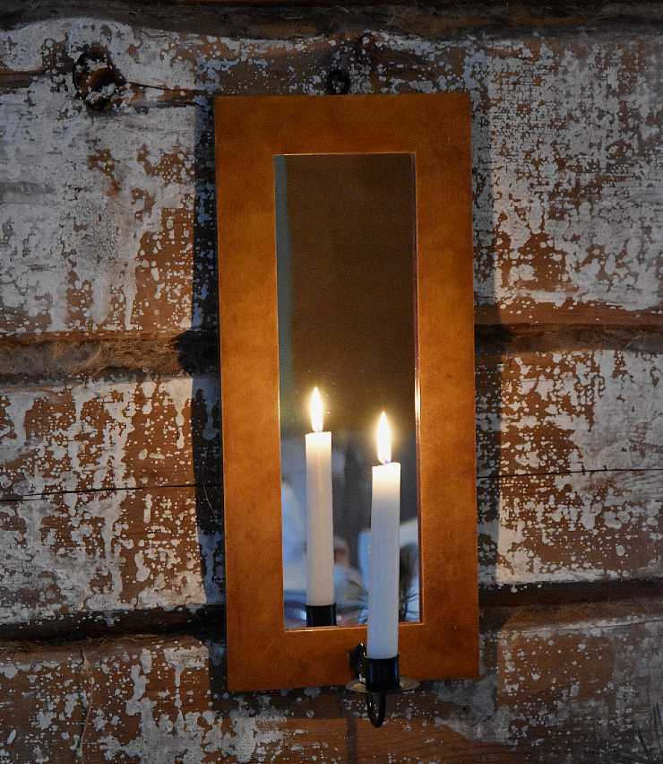 Spegellampett efter förlaga från 1920-talet med listhyvlat ramverk. Glasad med handblåst spegelglas. Tunt bakstycke av trä. Ljusarm av linoljebränt smide och upphängningsögla i järn.